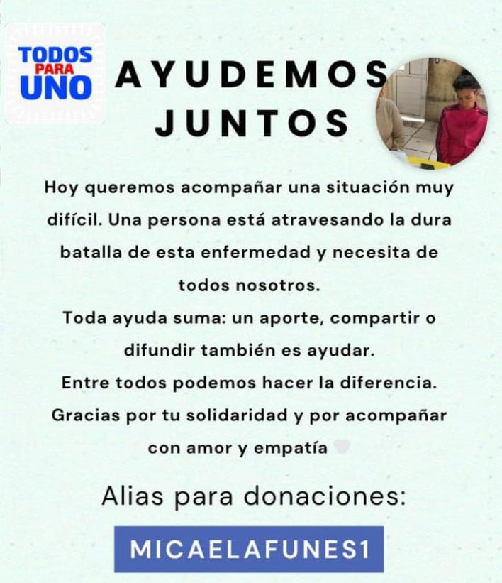 El tratamiento, que incluye la cirugía, tiene un costo total de 4 millones de pesos. Para recaudar fondos, se están generando varios beneficios y se ha creado un alias, micaelafunes1, para que quienes deseen colaborar puedan hacerlo. «Por favor, quienes quieran colaborar con lo que puedan, que lo hagan; nos va a ayudar mucho», dijo Fagundez.