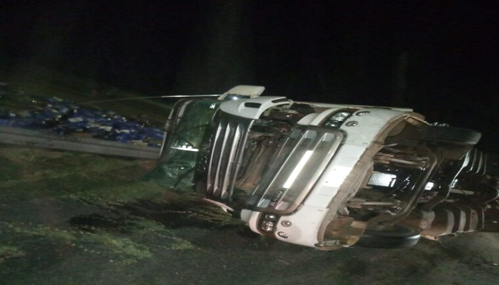 Personal policial de la comisaría 22 arribó al lugar luego de recepcionar un llamado del 911 que daba cuenta del vuelco de un camión con acoplado que contenía como carga bebida alcohólica de la firma Fernet Branca.