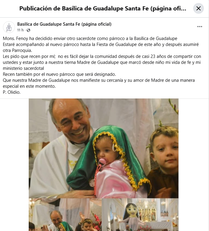El sacerdote recordó que lleva casi 23 años en la Basílica y adelantó que acompañará al nuevo párroco que tendrá la iglesia hasta la fecha de la próxima fiesta de la Virgen de Guadalupe. Según el cura, fue una decisión del Arzobispado de Santa Fe designar a un nuevo párroco.