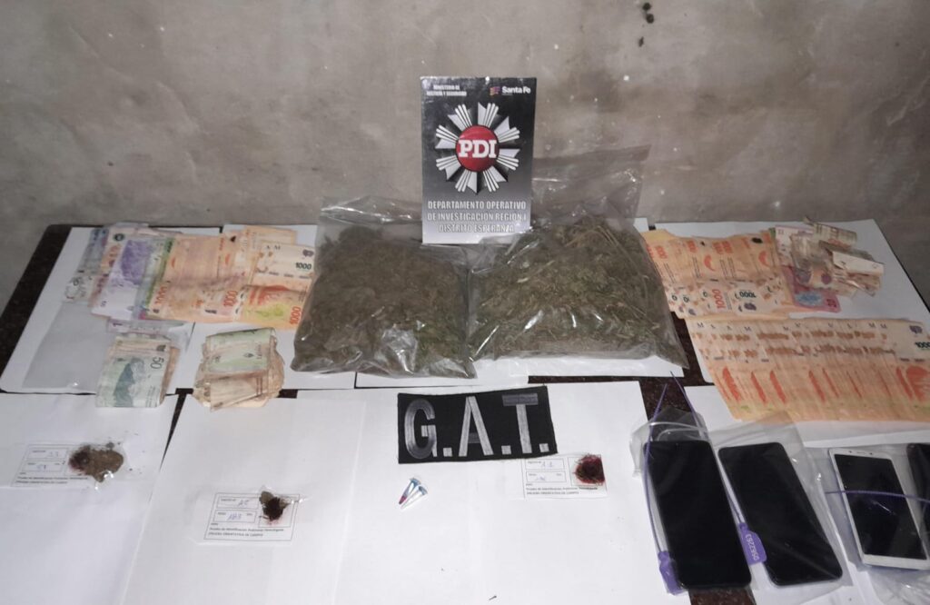 Como resultado, los agentes de PDI con las órdenes de allanamiento expedidas por S.S. Juez IPP PABLO SPEKULJAK y solicitados por el Fiscal Alejandro Benitez y con la colaboración del Grupo Táctico de la DGPAT (GAT) secuestraron 4 teléfonos móviles, más de $180.000 pesos, 339 gramos de marihuana y elementos de valor judicial.