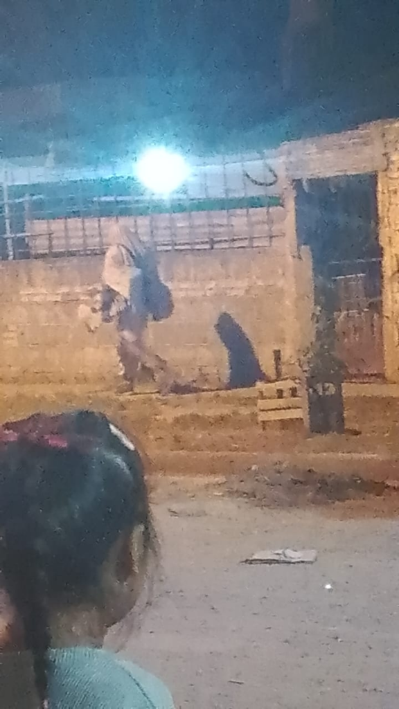 caminaba con una sábana blanca cubriéndose parcialmente el rostro, una mochila y varias cajas de cartón
