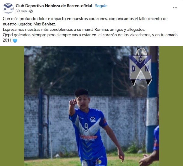 Max Tiziano Benitez vivía en el barrio Nobleza y era jugador de futbol del club. Profundo dolor en la comunidad recreina que acompaño en los últimos días con cadenas de oración.
