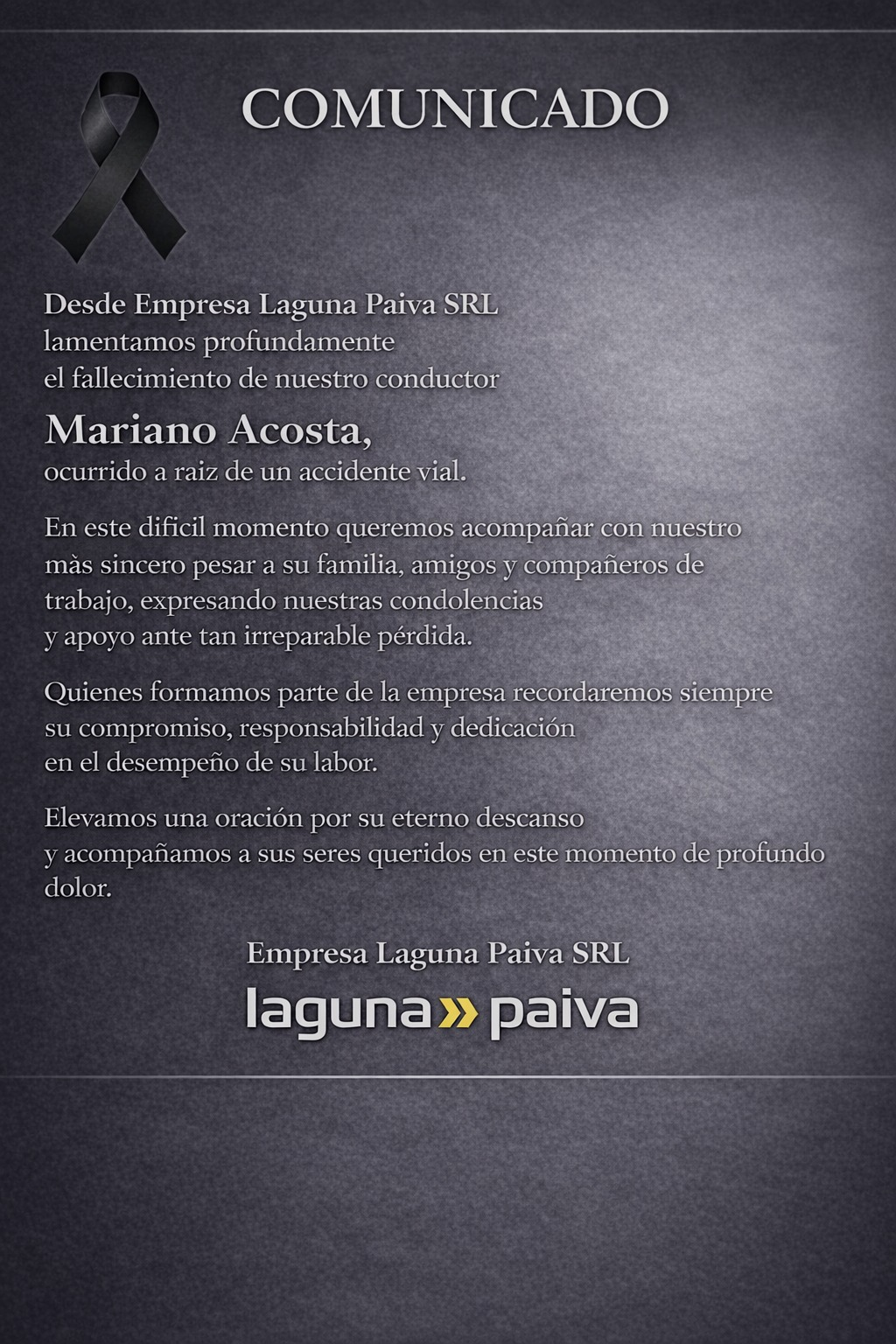 La empresa Laguna Paiva SRL expresó un comunicado donde expresa el profundo dolor por la muerte del conductor de colectivo, Mariano Acosta, que ocurrió a raíz del accidente vial esta mañana.