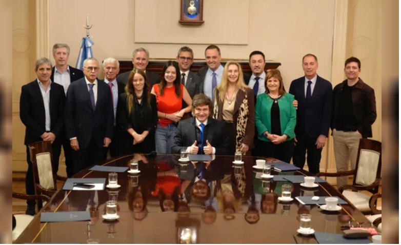 Esta mañana, se dan cita alrededor de la ovalada mesa del Eva Perón, el libertario, el jefe de Gabinete, Manuel Adorni, y los ministros Diego Santilli (Interior), Luis Caputo (Economía), Pablo Quirno (Relaciones Exteriores, Comercio Internacional y Culto), Mario Lugones (Salud), Sandra Pettovello (Capital Humano), Mariano Cúneo Libarona (Justicia), Patricia Bullrich (Seguridad) y Luis Petri (Defensa).