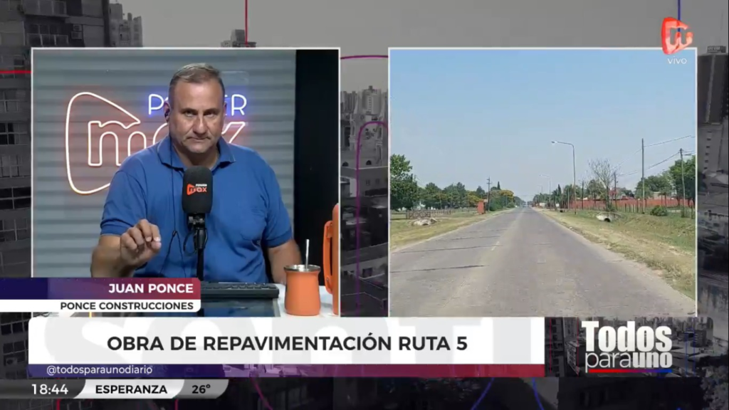 Juan Manuel Ponce dialogó en TODOS PARA UNO y se refirió a la obra de la ruta provincial N.° 5, entre Recreo y Monte Vera; dijo que «se encuentra en una etapa inicial de planificación, lo que explica la falta de maquinaria visible en el lugar». Agregó que en poco tiempo se verán máquinas en el lugar, sobre todo «en la rotonda de la ruta 2 y 5 que será de hormigón, a la altura de la estación de servicio SHELL de Monte Vera»; será para ordenar el flujo vehicular en un cruce clave.