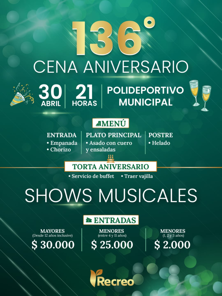 La Municipalidad de Recreo invita a la comunidad a participar de la Cena Aniversario por los 136 años de la ciudad, una propuesta que combinará gastronomía y espectáculos en vivo.