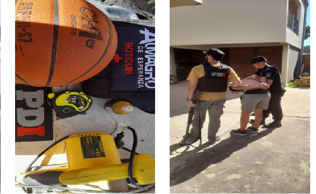 En tanto, los agentes a cargo de la investigación llevaron adelante una requisa domiciliaria en calle Lavalle al 1200, donde secuestraron elementos que habrían sido robados en el club: (01) una sierra circular marca STANLEY; (01) un bolso topo morral, negro, inscripción “ALMAGRO DE ESPERANZA – BOTIQUÍN”; (01) una cinta métrica, 10 m, marca GIANT; (01) una pelota de básquet marca CH1; (01) un frasco plástico conteniendo iodopovidona; (01) una mochila, negra, marca MOTOR OIL; (01) una tablet, marca PHILCO, 10 pulgadas; (01) un cargador cable USB; (01) una trincheta; (02) dos guantes; (01) una crema Klonafenac extreme y (01) una botella de alcohol 250cc.