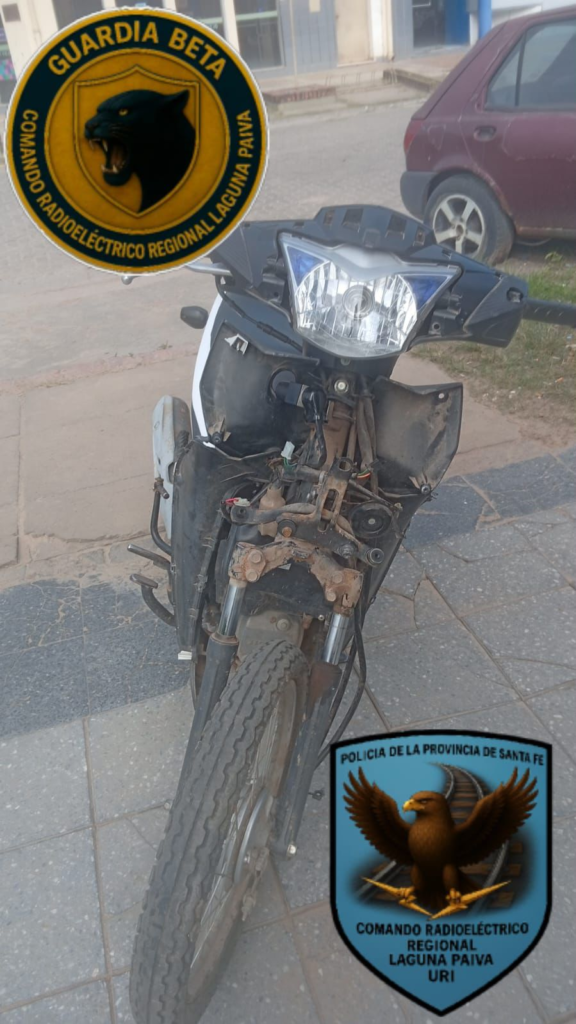 En la jornada de este martes, personal del Comando Radioeléctrico de Laguna Paiva, en patrullaje preventivo, observa un motovehículo conducido por un masculino sin casco, sin espejos y sin chapa patente, por lo que se le da la voz de alto mediante señales lumínicas y sonoras, haciendo caso omiso y dándose a la fuga.