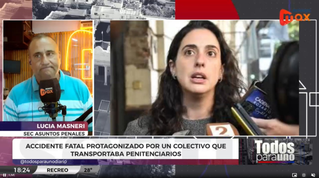 En diálogo con TODOS PARA UNO, Luciana Masneri, Secretaria de Asuntos Penitenciarios de Santa Fe, destacó la labor del joven paivense: «Nosotros, en primer lugar, también estamos muy agradecidos porque realmente sabemos y, entendiendo la mecánica del accidente, sabemos que podrían haber sido muchísimas, muchísimas más las pérdidas si no se hubiera mantenido firme y sostener el volante, atravesando 4 carriles de la autopista y dejar de pie el colectivo y salvar a todo el pasaje».