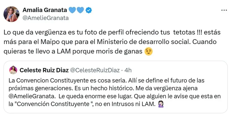 Granata respondió con un mensaje que intensificó el tono del cruce. «Lo que da vergüenza es tu foto de perfil ofreciendo tus tetotas. Estás más para el Maipo que para el Ministerio de Desarrollo Social. Cuando quieras te llevo a LAM porque morís de ganas», publicó la legisladora.