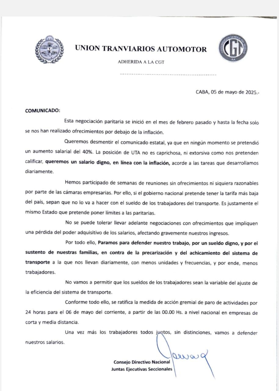 UTA rechazó las ofertas salariales de los empresarios. Reclama un básico de $1.700.000. La huelga comenzará a la hora cero y se extenderá por 24 horas. Afectará a más de 300 líneas en el AMBA y al interior.