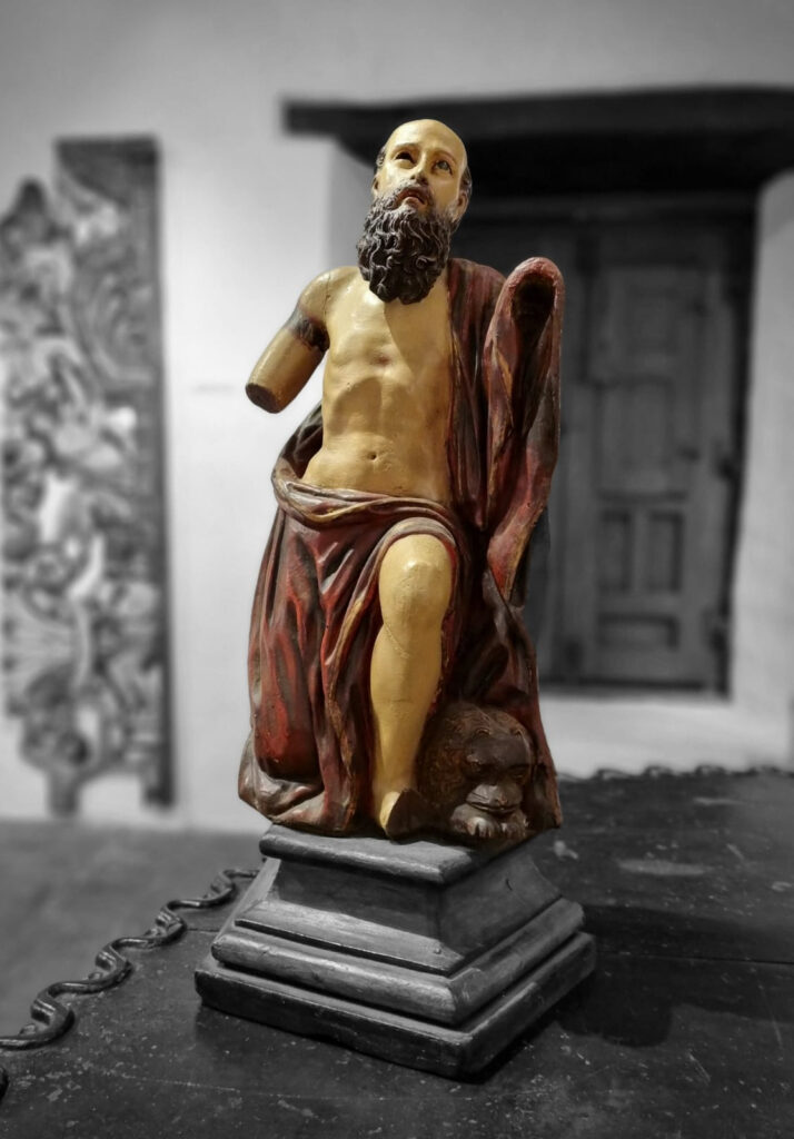 Una de ellas es una talla de madera del siglo XVIII, la que pertenece a la colección del Museo Histórico Provincial de Santa Fe. Esa figura lo muestra como un anacoreta, semidesnudo y cubierto por un manto rojo, contemplando la cruz y golpeándose el pecho con una piedra. Con una pluma en la mano o una piedra para golpearse el pecho. Una calavera en la tabla sobre la que escribía y en la que se apilaban los libros que leía. Y un león que custodiaba la cueva como manifestación de agradecimiento hacia el santo que lo había curado de una herida en una de sus patas. Si bien la pieza presenta faltantes, especialmente de sus brazos, todo hace indicar que respetaba esta fórmula iconográfica.