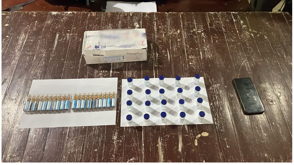 Se trata de 40 frascos de vidrio que contenían las sustancias ilícitas (20 de cada una) que estaban siendo transportadas en una caja de cartón.