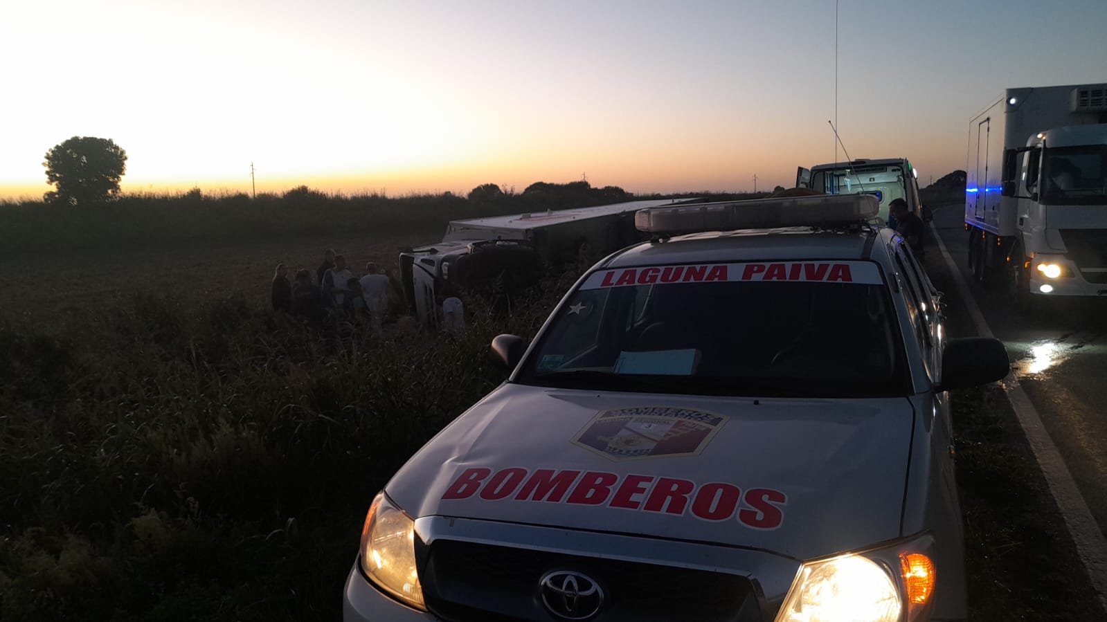 El camión de la empresa CARNAVE, trasladaba cajones de pollos se dirigía hacia el norte de la provincia, en una curva a la altura de la localidad de Cabal, el conductor pierde el control y tumba el camión sobre banquina. Trabajo bomberos de Laguna Paiva para sacar al conductor que había quedado atrapado-