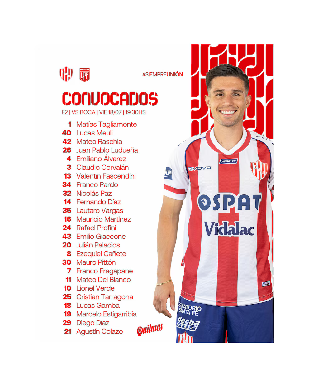 Unión de Santa Fe: Matías Tagliamonte; Lautaro Vargas, Franco Pardo, Valentín Fascendini; Mateo Del Blanco; Julián Palacios, Mauro Pittón, Mauricio Martínez, Franco Fragapane; Cristian Tarragona y Lucas Gamba. DT: Leonardo Madelón.