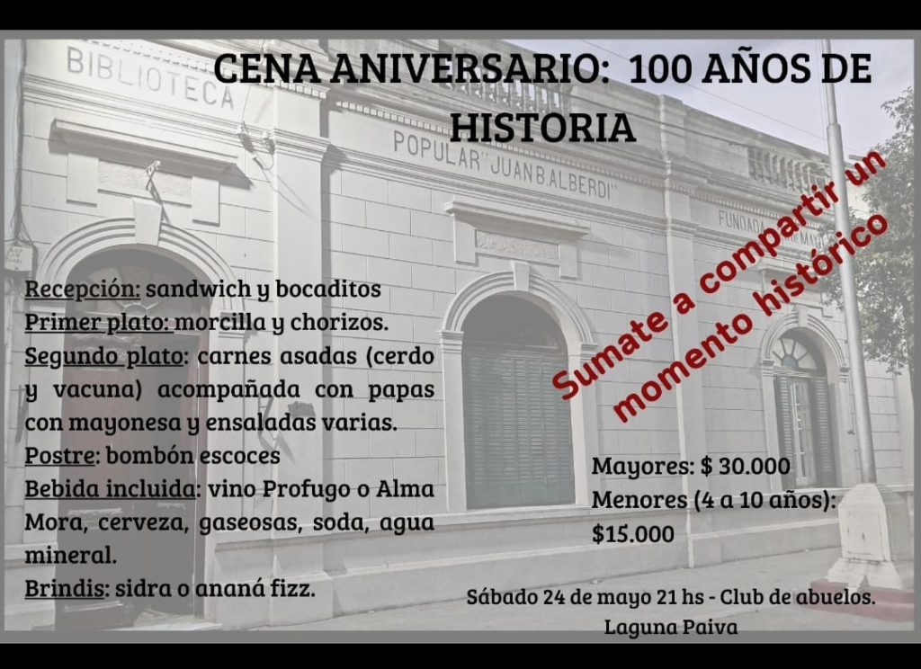 Venden tarjetas para la cena por los 100 años de la Biblioteca Juan Bautista Alberdi de Laguna Paiva